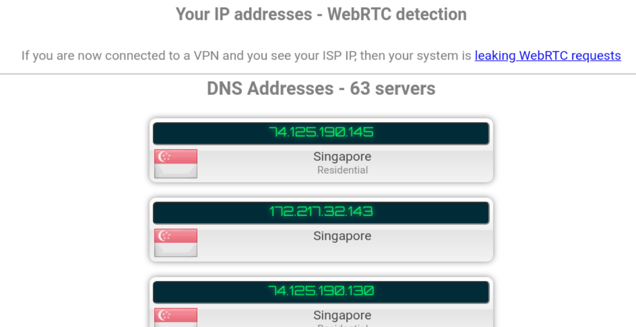 First of all, we tried to detect any IP leaks in our VPN browsers through the famous website called ipleaks.net. The website confirmed that the VPN didn’t have any IP leaks and all its DNS servers weren’t leaking the IP address. We had connected to a VPN server in Singapore to check the problem.