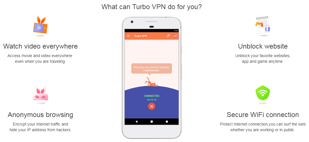 Turbo VPN has a fast-running hare for its mascot and doesn’t shy away from portraying itself as a speedy service. Even the VPN’s official website claims that it connects its users with “the speed of a hare.”